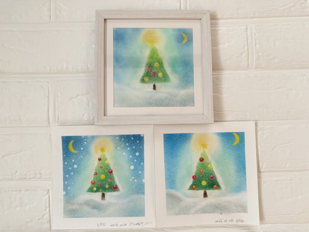 202510季節のテーマ講座(くりすますつりー) ぱすてるあーと Twitter Facebook はてブ Pocket LINE コピー 2025.10.26 2025.10.24 今月の季節のテーマ講座は、少し早めにクリスマスツリーを描きました。雪はいらないというので、なし。グラデーションの描き方が難しかったようですが、まだらになった感じも個性豊かな表現で素晴らしい♡世界にひとつの作品が出来上がりました!雪降らせバージョン、12月にぴあぱーく妙典にて子ども向け講座で行いますよ!良かったら是非お越しくださいね♡#パステルアート#パステル和アート#アトリエ童#季節のテーマ講座#クリスマスツリー