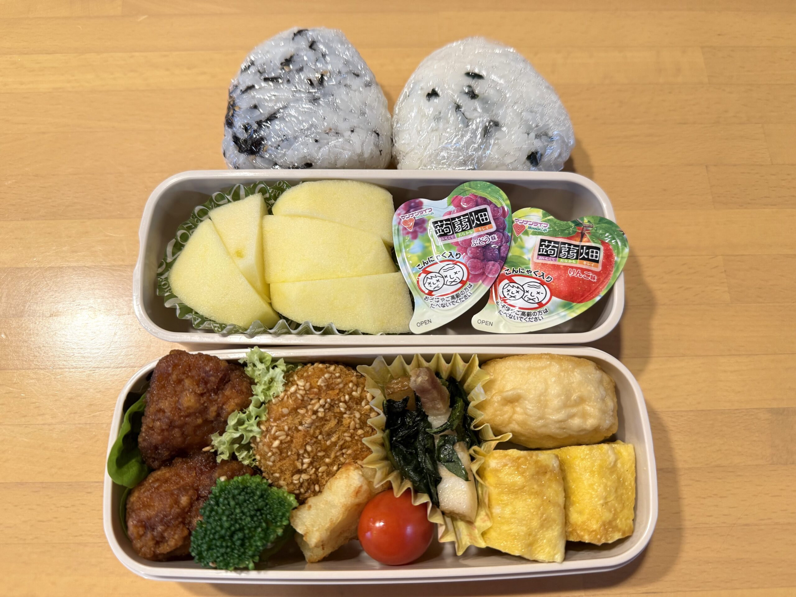 お弁当メニューおにぎり2種(ひじき、わかめ)甘酢唐揚げ、星ポテト、かぼちゃコロッケ、はんぺんあげ、卵焼き、ほうれん草ベーコン炒め、レタス、ブロッコリー、プチトマト、りんご、りんごゼリー、ぶどうゼリー#中学生応援弁当