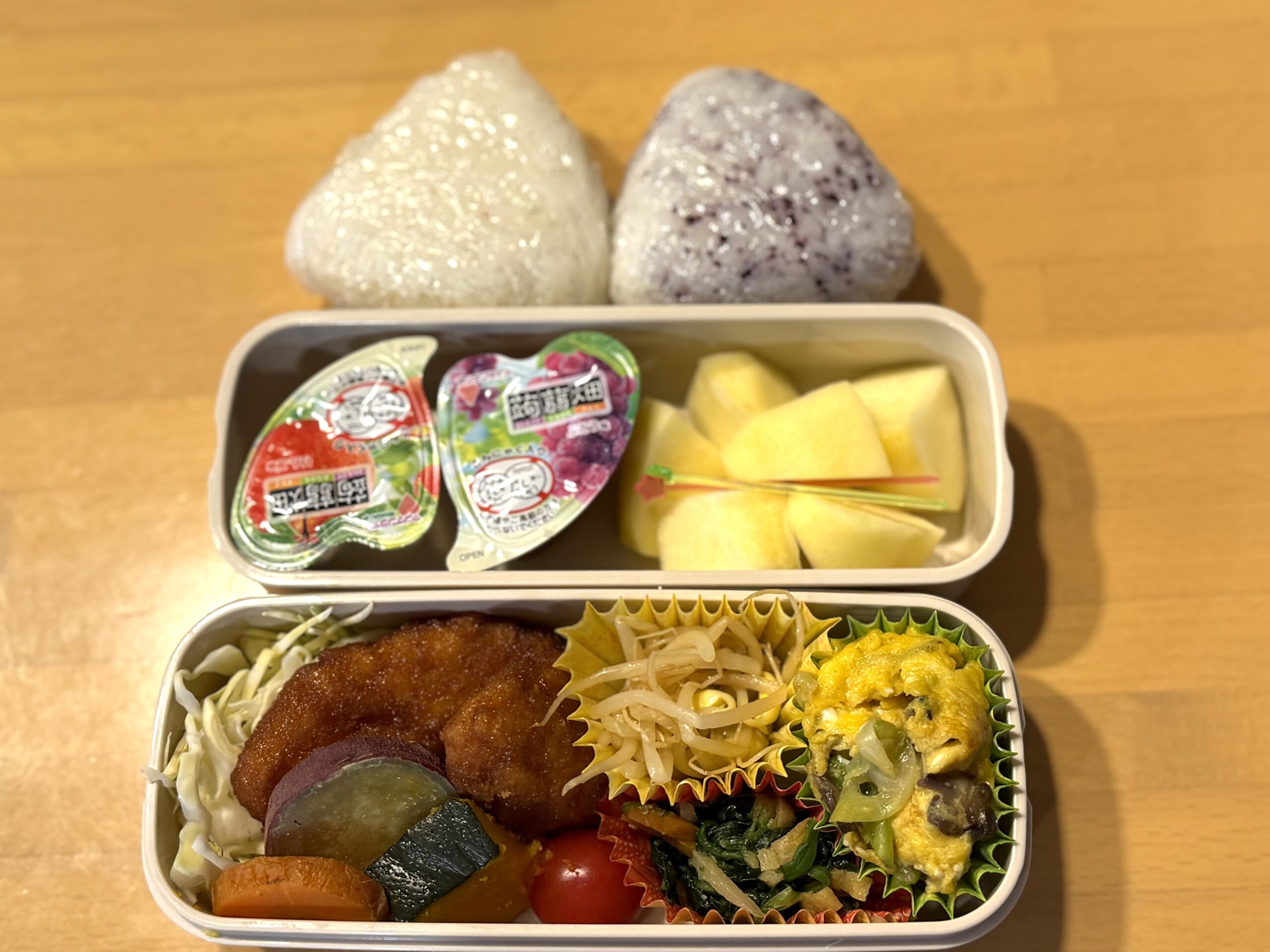 おにぎり2種(ゆかり、塩)甘辛カツ、豆もやしナムル、ほうれん草のおひたし、