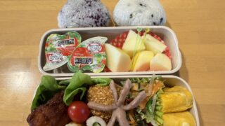 今日は来月から行う新入生勧誘の打ち合わせがあるらしい。ありあわせのものだけど、最終学年がんばれ!お弁当箱は、幼稚園からの愛用ミッフィーでした。お弁当メニューおにぎり2種(塩シャケ、わかめ)キャベツ、鶏からあげ、かぼちゃコロッケ、卵...